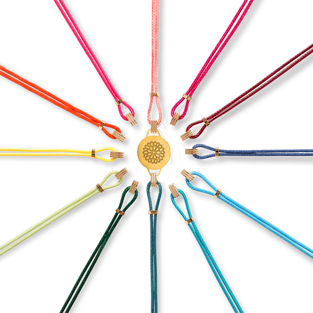 Vous pouvez compléter votre achat, ou votre collection avec nos 24 couleurs de bracelets en cordon à noeuds coulissants, ou la chaîne bijou.