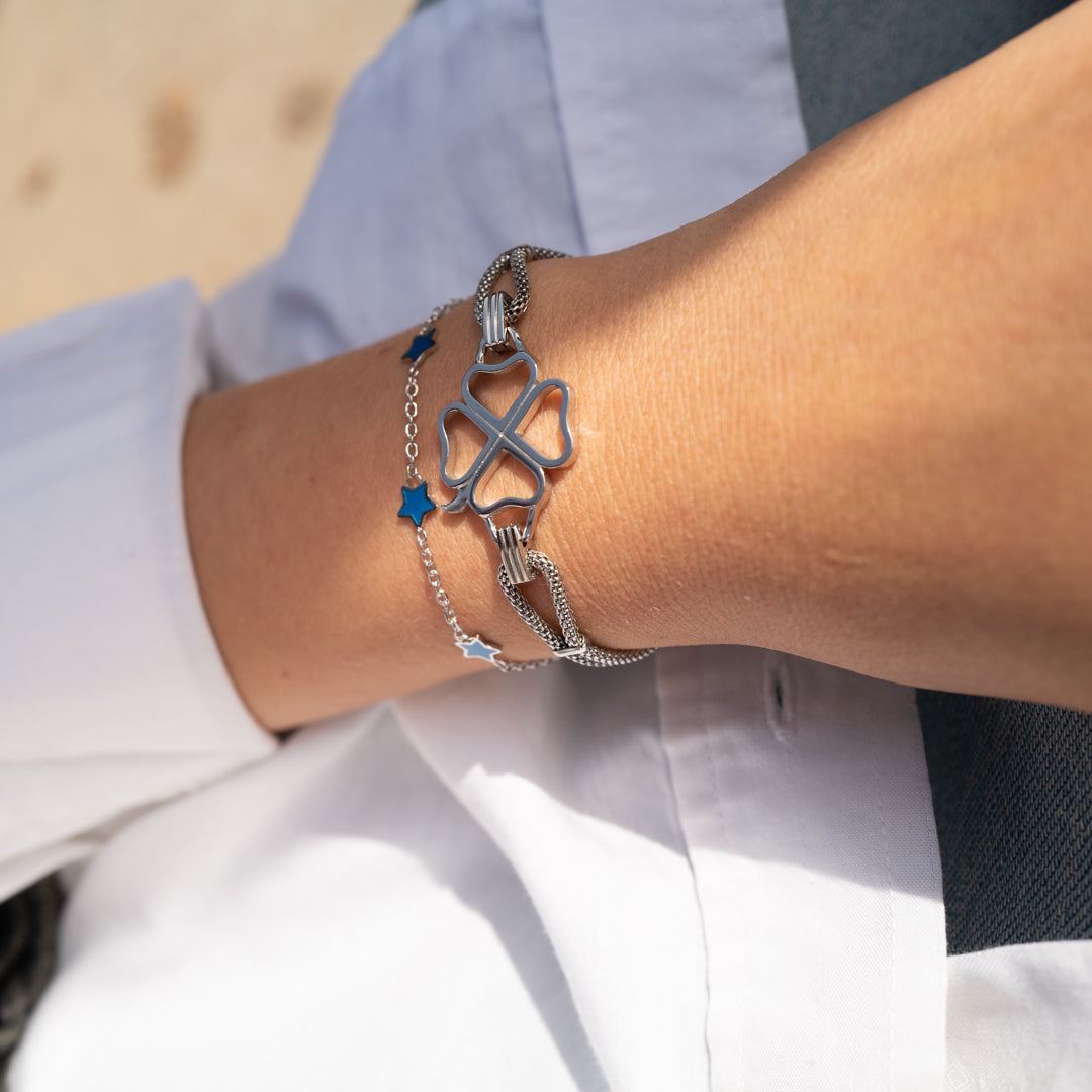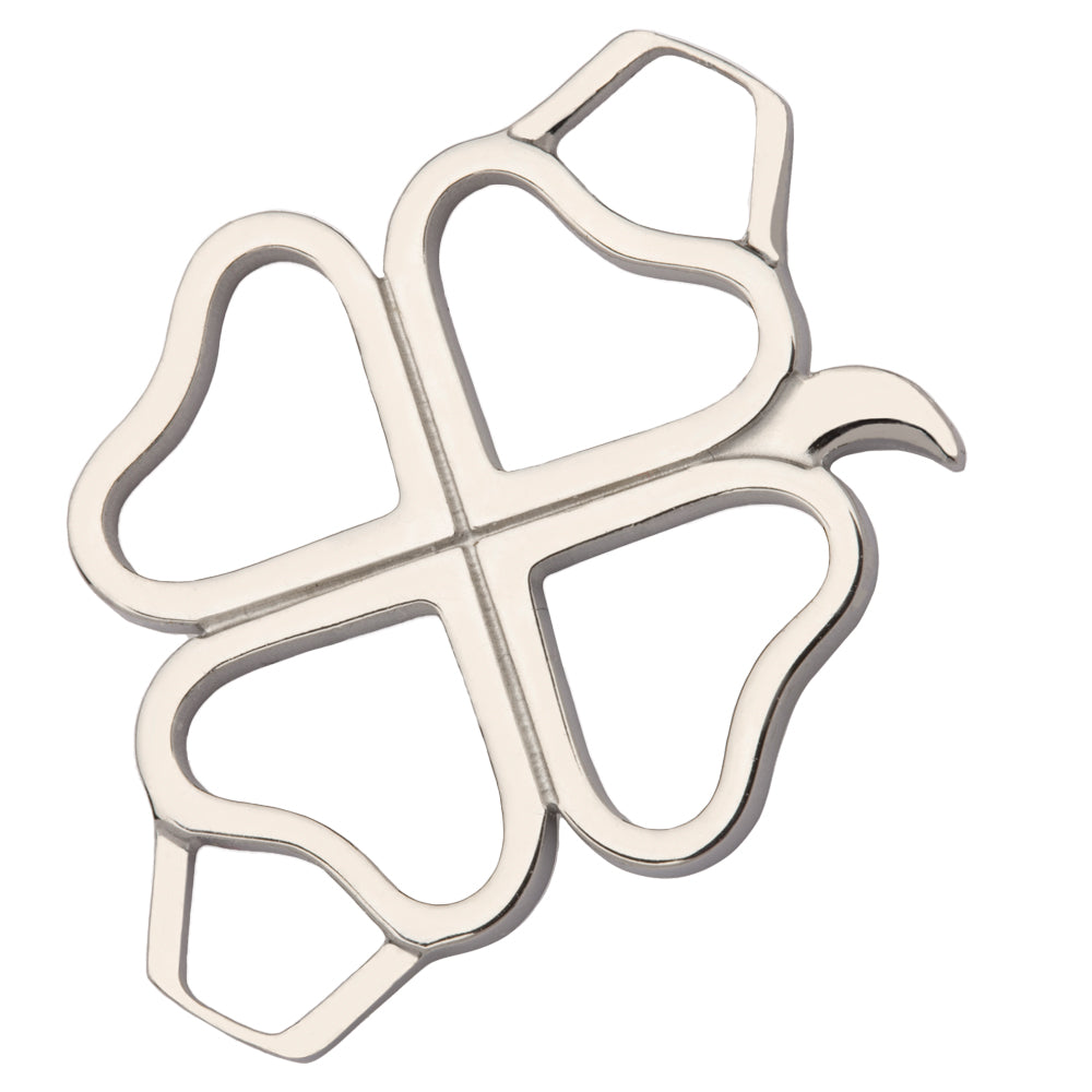 Un trèfle porte-bonheur en acier inoxydable, colori acier ou plaqué (IP) en colori or, ou or rose. Vous l'associez avec un cordon à noeuds coulissants parmi nos 24 couleurs de bracelets, ou à sa chaîne bijou plus chic.