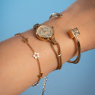 La parfaite parure à votre poignet. Une montre portée sur une chaîne bijou délicate et intemporelle, à porter en accumulation avec son jonc et son bracelet star assorti.