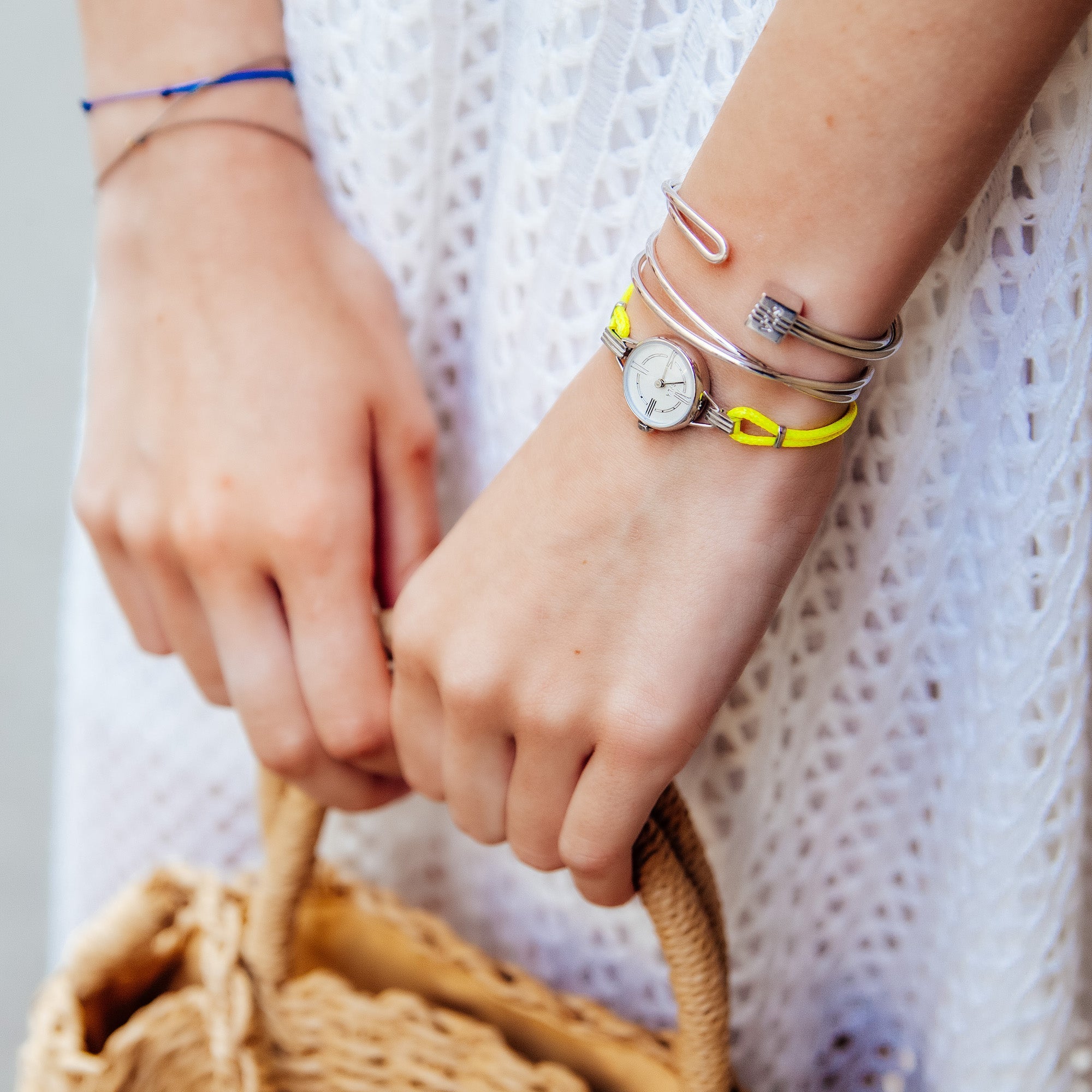 Avec le système de nœuds coulissants de nos bracelets couleurs en coton, et la chainette réglable de nos bracelets chaines bijoux, chacune de nos montres se règle facilement à la taille de votre poignet.
